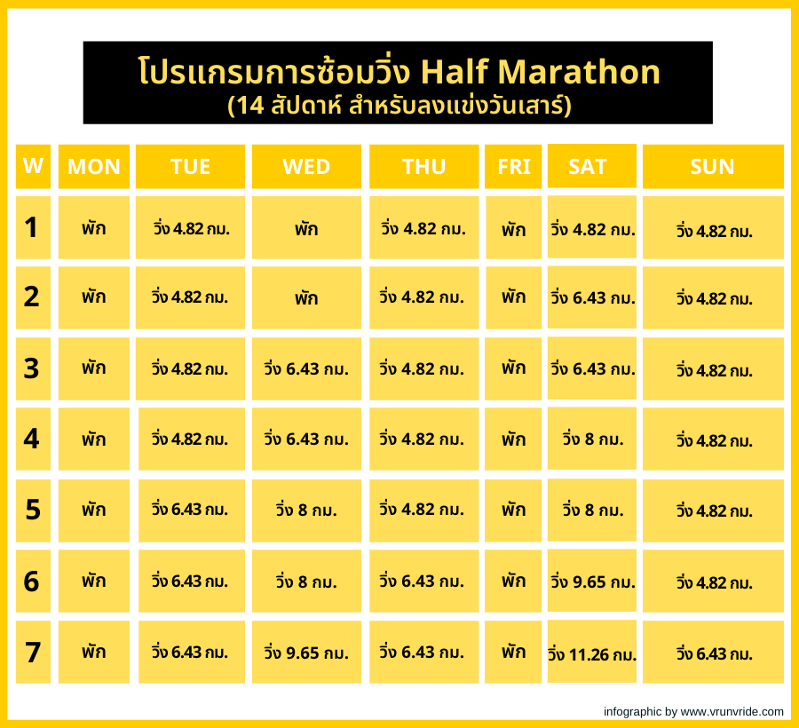 โปรแกรมการซ้อมวิ่งฮาล์ฟมาราธอน 14 สัปดาห์ สำหรับคนที่ลงแข่งในวันเสาร์