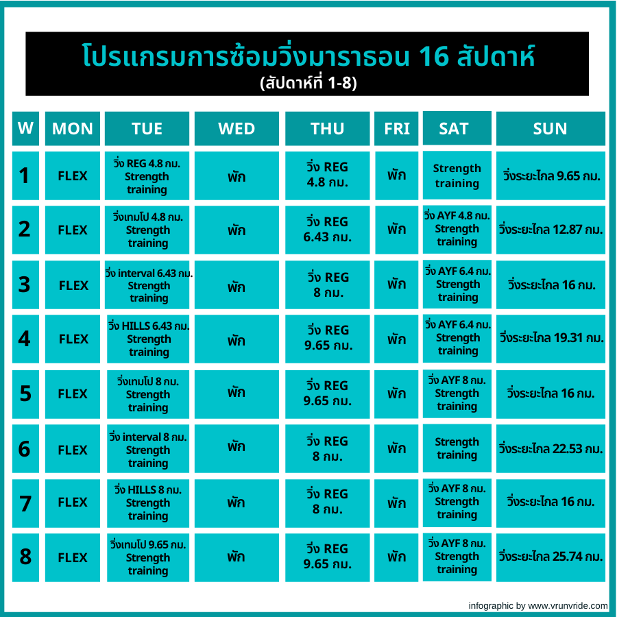 - วันพฤหัส : วิ่ง REG 8 กม.
