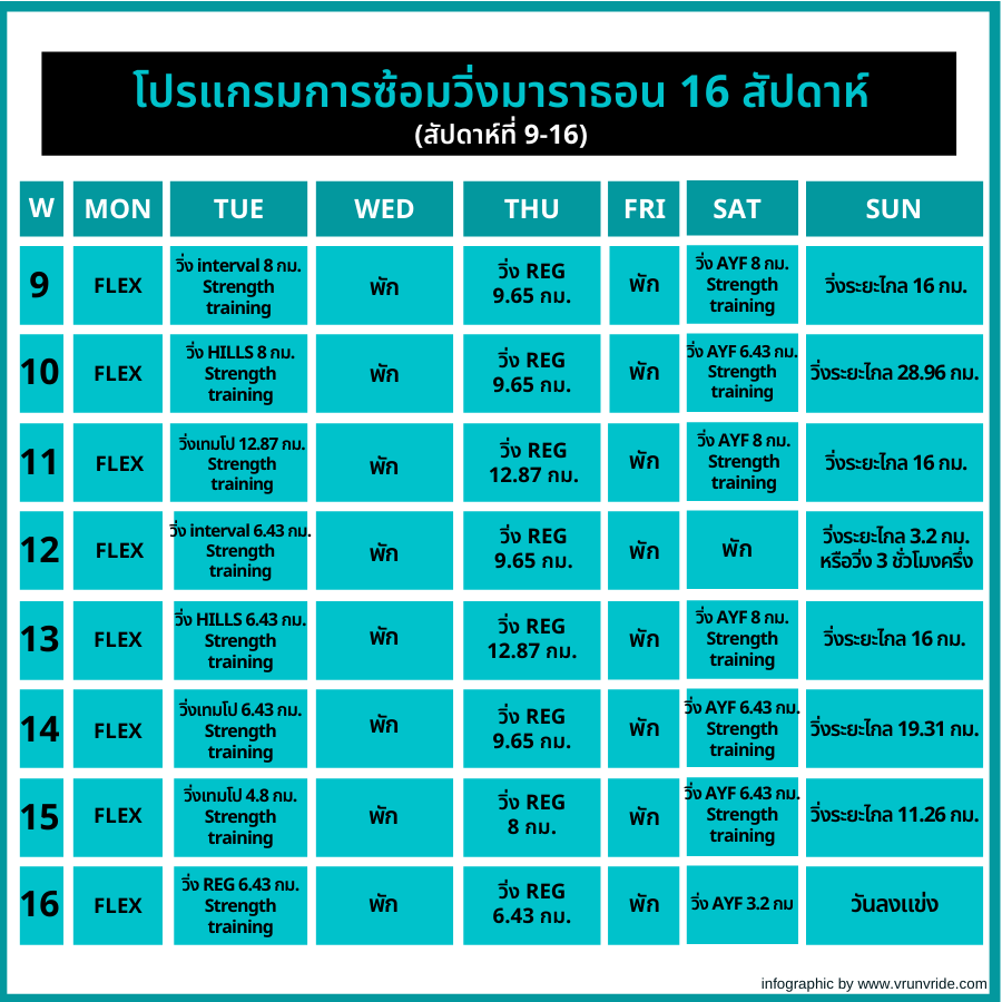 - วันอาทิตย์ : วิ่งระยะไกล 16 กม.