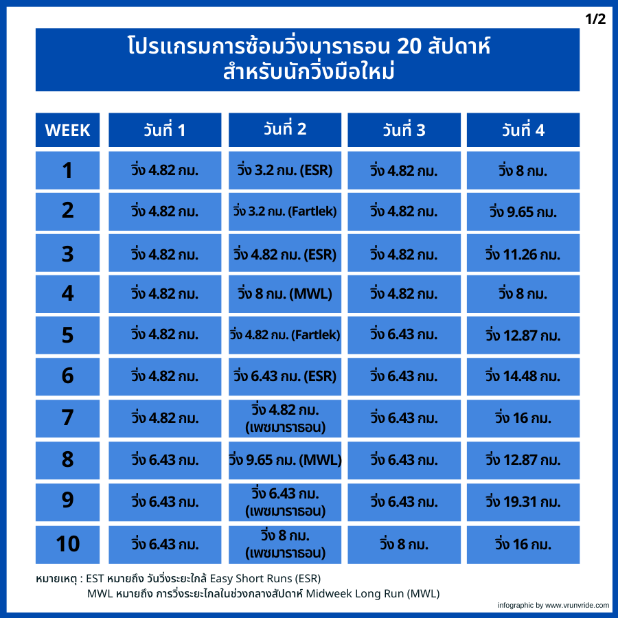 โปรแกรมการซ้อมวิ่งมาราธอน 20 สัปดาห์ สำหรับนักวิ่งมือใหม่ (สัปดาห์ที่ 1-10)