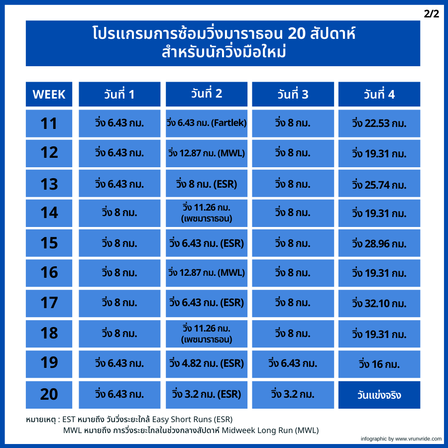 โปรแกรมการซ้อมวิ่งมาราธอน 20 สัปดาห์ สำหรับนักวิ่งมือใหม่ (สัปดาห์ที่ 11-20)