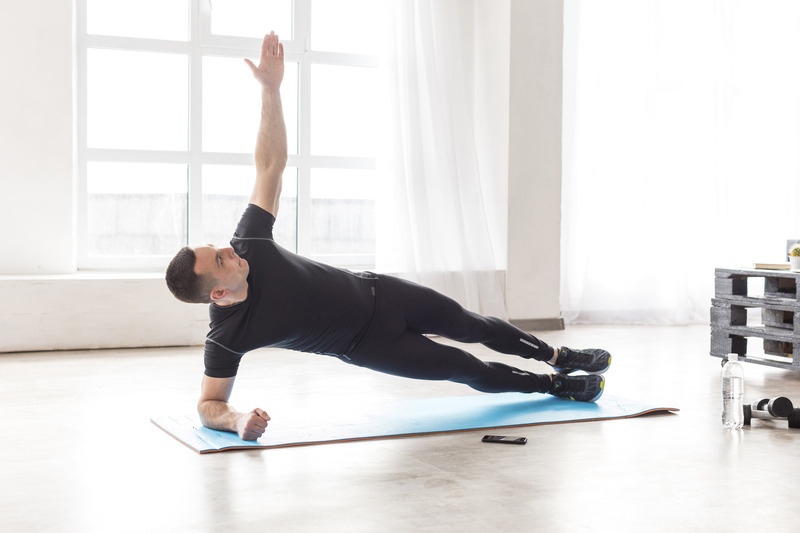 - เริ่มต้นในท่า Side Plank โดยวางแขนขวาลงกับพื้น ทำตัวเป็นเส้นตรงตั้งแต่หัวจรดเท้า วางขา เข่า และก้นทับขาด้านล่างไว้ ตำแหน่งศอกขวาจะต้องอยู่ใต้หัวไหล่