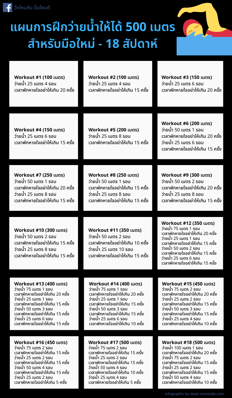 18 แผนการซ้อมว่ายน้ำตั้งแต่ 100 เมตร จนถึง 500 เมตร (ทั้งหมด 18 สัปดาห์)
