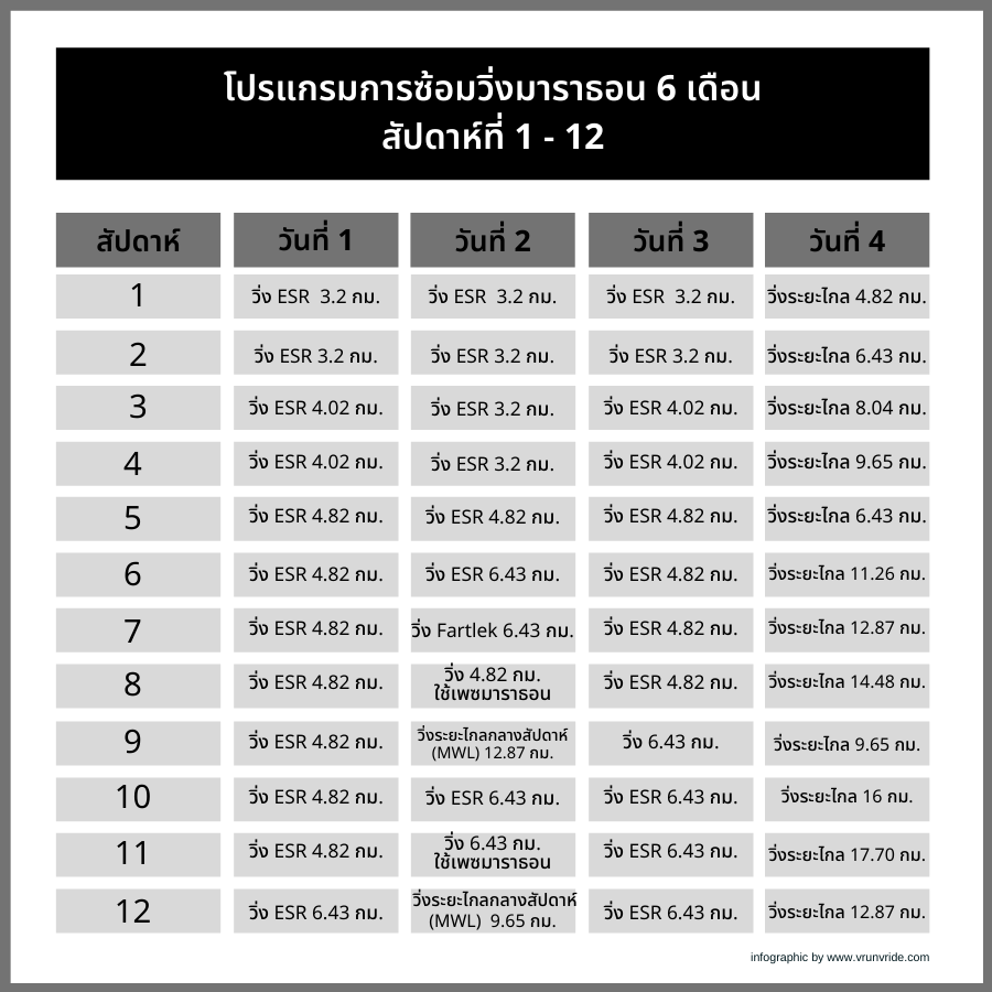โปรแกรมการซ้อมวิ่งมาราธอน 6 เดือน สัปดาห์ที่ 1-12
