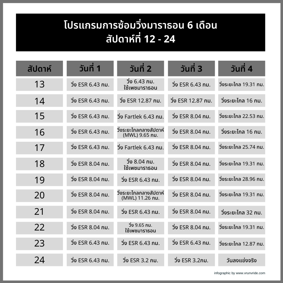 โปรแกรมการซ้อมวิ่งมาราธอน 6 เดือน สัปดาห์ที่ 13-24