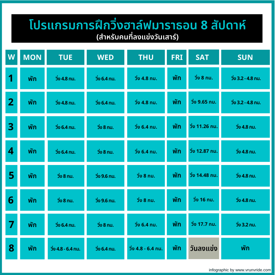 โปรแกรมการฝึกวิ่งฮาล์ฟมาราธอน 8 สัปดาห์ สำหรับคนที่ลงแข่งวันเสาร์
