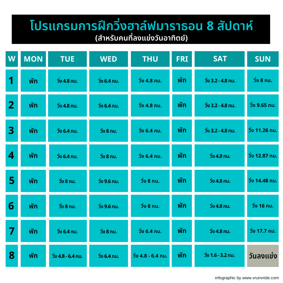 โปรแกรมการฝึกวิ่งฮาล์ฟมาราธอน 8 สัปดาห์ สำหรับลงแข่งในวันอาทิตย์