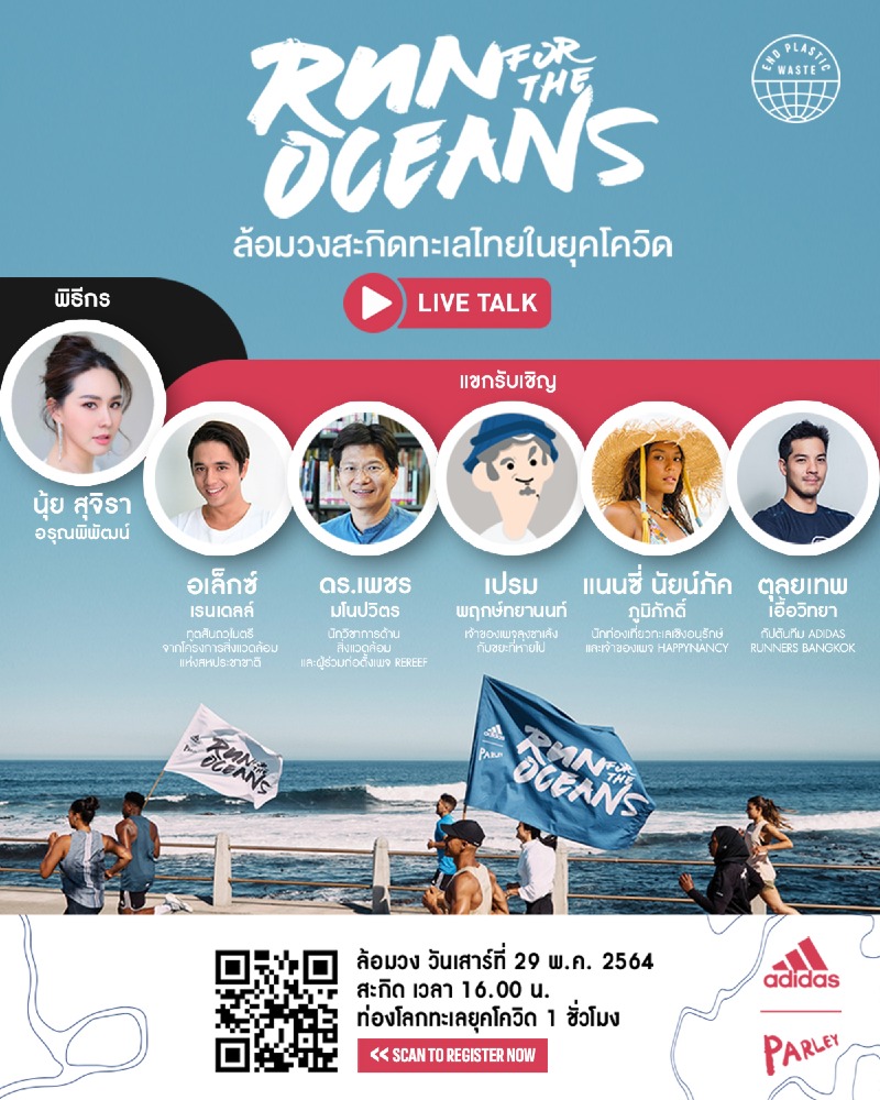 ครั้งแรกของอาดิดาส (ประเทศไทย) กับการจัดกิจกรรมทางออนไลน์ Run For The Oceans “ล้อมวงสะกิดทะเลไทยในยุคโควิด” ที่เปิดโอกาสให้ทุกคนได้ร่วมตระหนักถึงปัญหาและผลกระทบที่เกิดขึ้นจากขยะพลาสติกในท้องทะเล ความเปลี่ยนแปลงของทะเลในช่วงโควิด-19 รวมถึงเทคโนโลยีและกิจกรรมของอาดิดาสที่จะมาช่วยปกป้องมหาสมุทรอย่างยั่งยืน พร้อมเปิดโอกาสให้ผู้ชมทางบ้านได้มีส่วนร่วมและแลกเปลี่ยนความคิดเห็นไปด้วยกันกับผู้รักสิ่งแวดล้อมตัวจริง