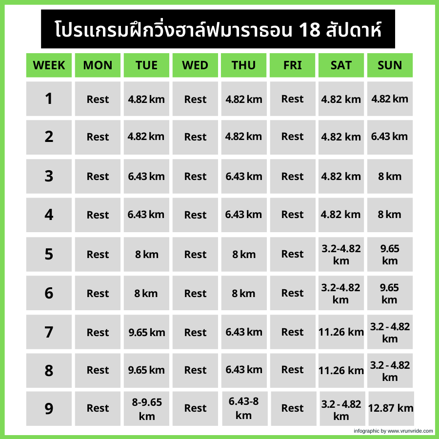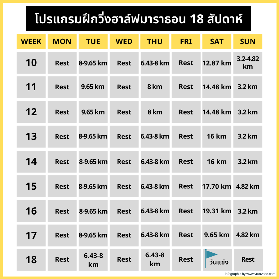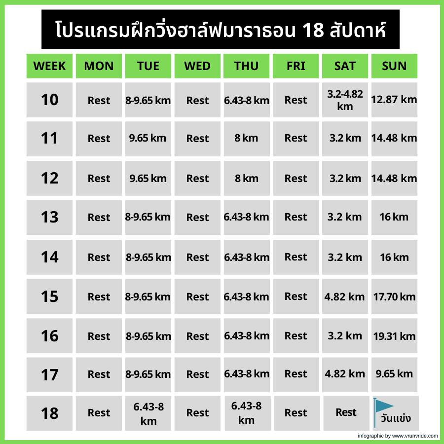 โปรแกรมการฝึกวิ่งฮาล์ฟมาราธอน 18 สัปดาห์ สำหรับแข่งวันเสาร์หรือวันอาทิตย์