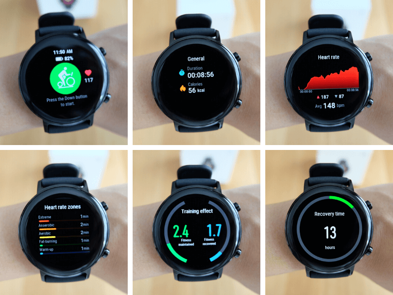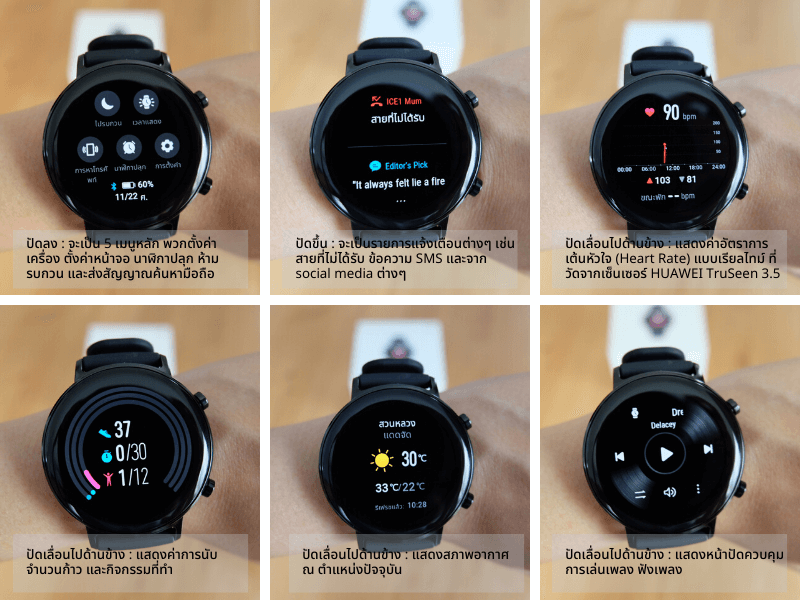 - ปัดเลื่อนไปด้านข้าง : จะมี 5 หน้าจอ คือ อัตราการเต้นของหัวใจเรียลไทม์ , แสดงกิจกรรมที่ทำ , สภาพอากาศ , ควบคุมเพลง และระดับความเครียดที่มีเฉพาะระบบ Android เท่านั้น