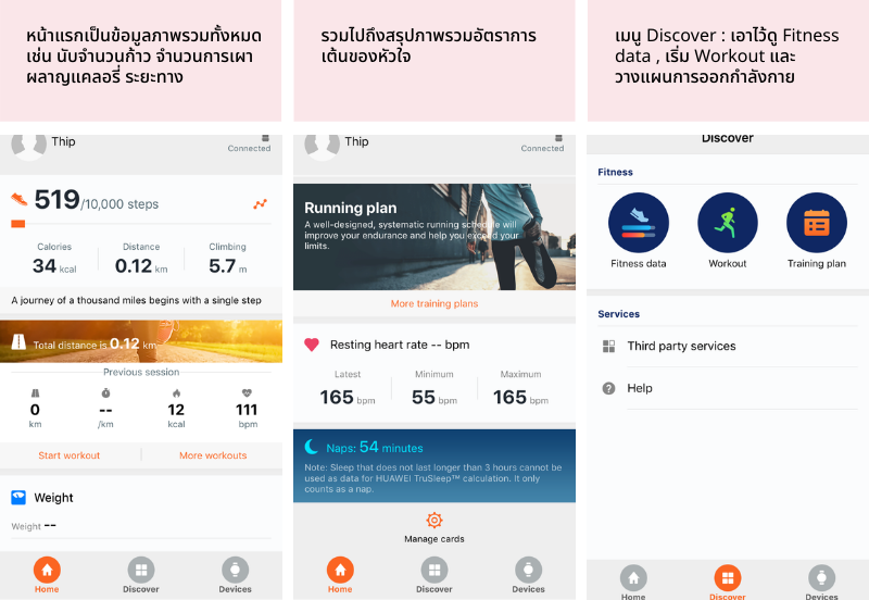 แต่ถ้าอยากดูสรุปภาพรวมการออกกำลังกายทั้งหมดของเรา ต้องไปดูในแอปพลิเคชั่น Huawei Health ค่ะ เพื่อนๆสามารถดูภาพด้านล่างพร้อมคำอธิบายได้เลย