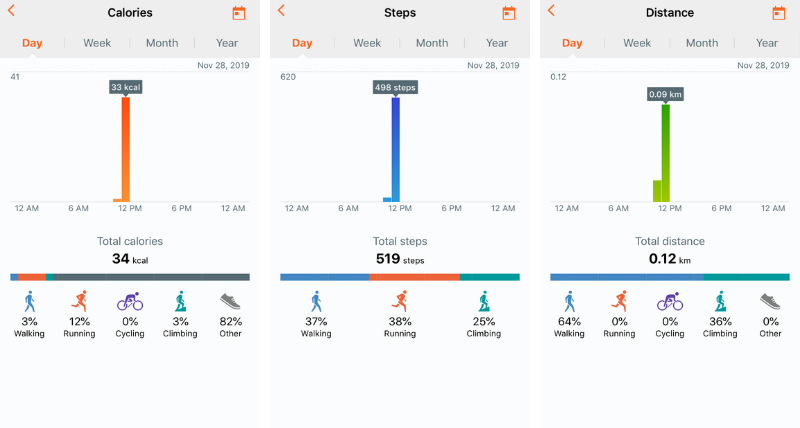 ด้านล่างนี้เป็นรายละเอียดย่อยของแต่ละค่า ได้แก่ จำนวนการเผาผลาญแคลอรี่ , จำนวนก้าว , ระยะทาง , อัตราการเต้นของหัวใจ และข้อมูลติดตามการนอนหลับที่ละเอียดตลอดทุกช่วงเวลาการนอน ไม่ว่าจะหลับลึก ช่วงตื่น หรืองีบหลับ