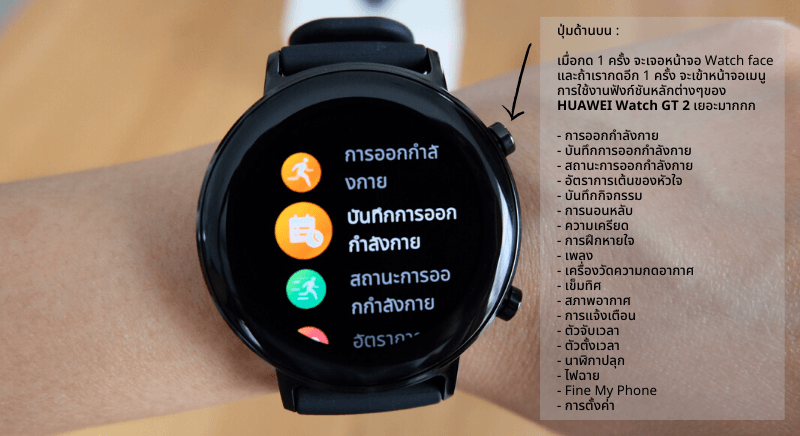 2. ปุ่มด้านบน : เมื่อกด 1 ครั้ง จะเปิดหน้าจอ Watch face ขึ้นมา และถ้าเรากดอีก 1 ครั้งก็จะเข้าหน้าจอเมนูการใช้งานฟังก์ชันหลักต่างๆของ HUAWEI Watch GT 2 (ดูรายละเอียดและคำอธิบายได้ที่รูปภาพด้านล่าง)