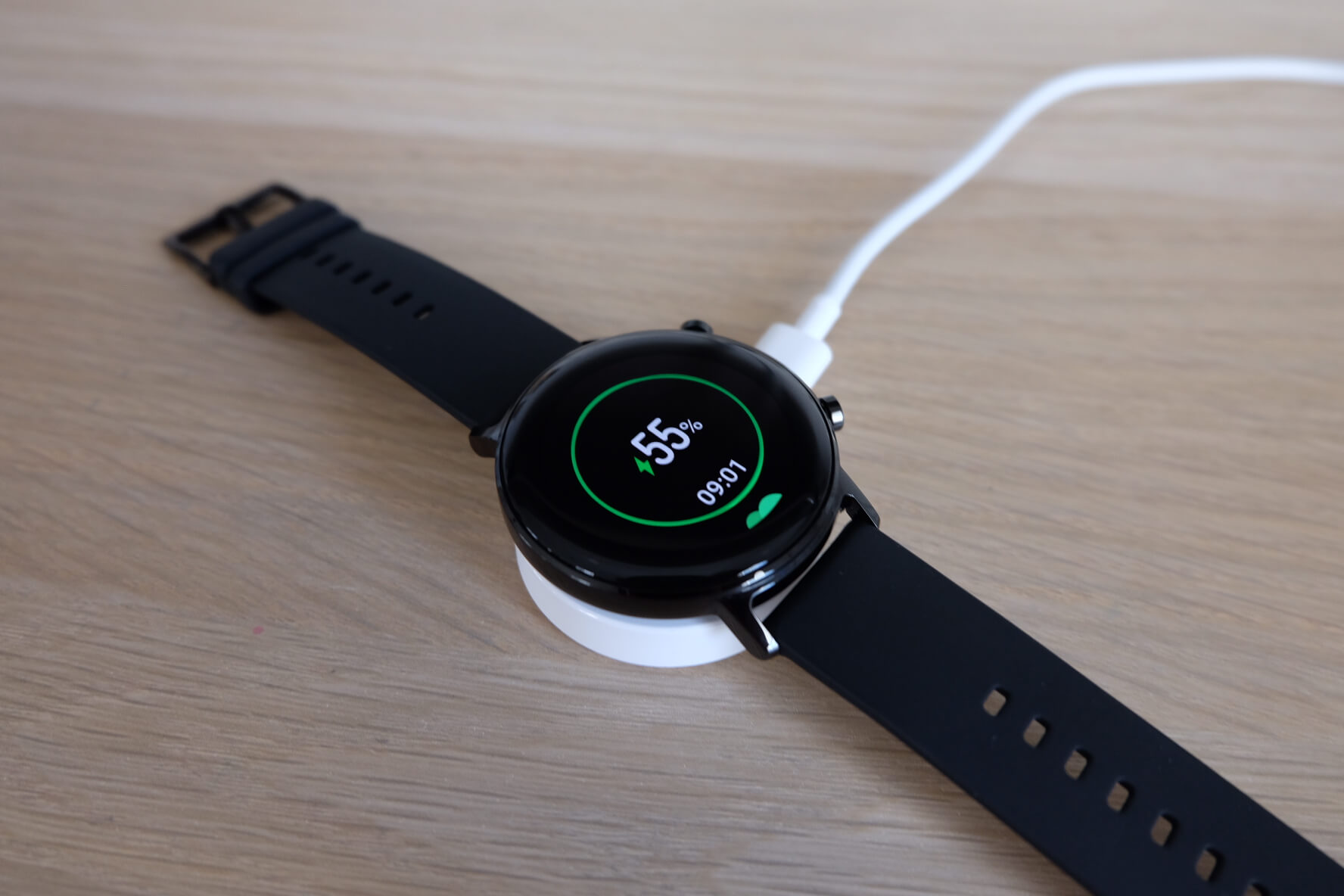 พร้อมสายรัดแบบ Fluorine Rubber ซึ่งเป็นสาย default ที่จะมีมาให้ทั้งรุ่นที่เป็นสายหนังและสายโลหะ - แท่นชาร์จ ทรงกลมสีขาว ที่แรงแม่เหล็กเหนียวแน่นหนึบดูดจับกับตัวนาฬิกาดีมาก