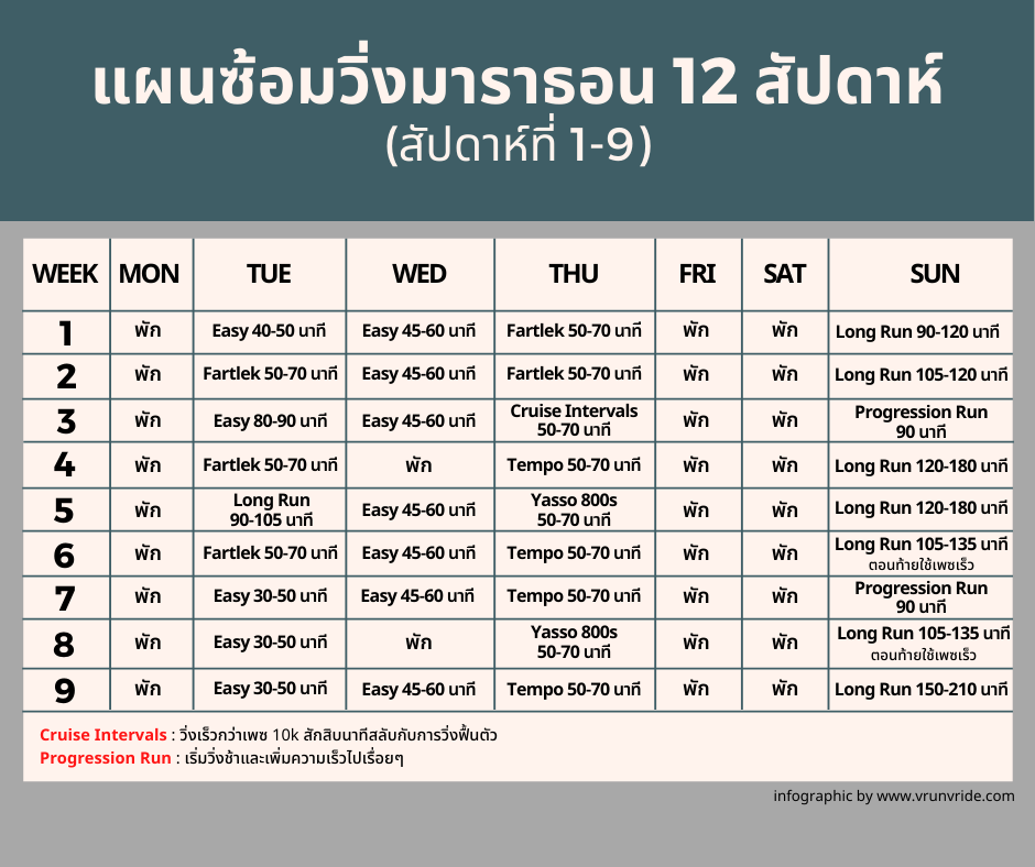 - วันอาทิตย์ : วิ่งระยะไกล 1 ชั่วโมง 45 นาที – 2 ชั่วโมง 15 นาที (ตอนท้ายให้ใช้เพซเร็ว)
