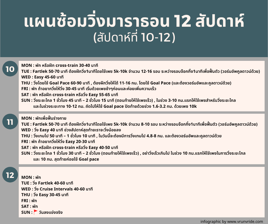 - วันอาทิตย์ : วิ่ง Progression Run (เริ่มวิ่งช้าและเพิ่มความเร็วไปเรื่อยๆ) 1 ชั่วโมง ครึ่ง