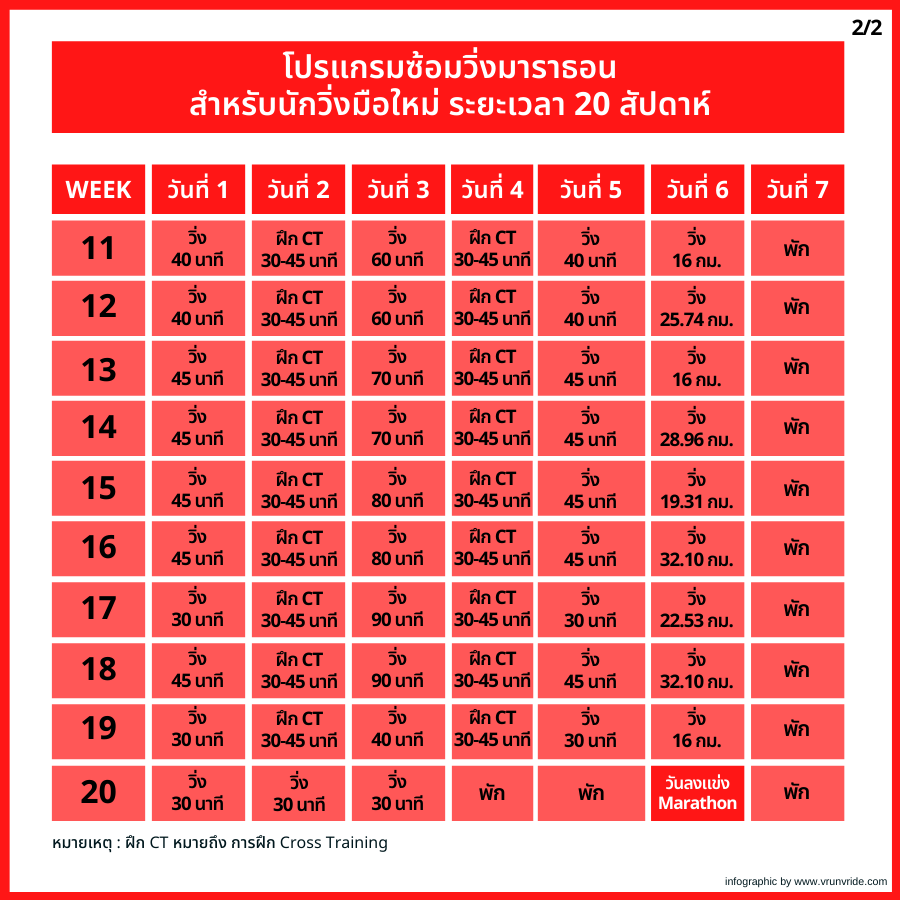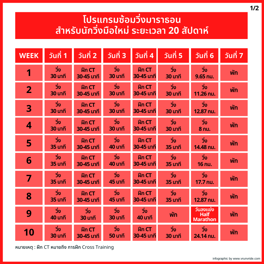 - การลงแข่ง : เพื่อนๆ อาจจะไปแข่งฮาล์ฟมาราธอนในช่วงสัปดาห์ที่ 10 ก็ได้ เพื่อให้เกิดความเคยชินกับขั้นตอนการแข่งขัน แต่ถ้าหางานแข่งที่ตรงกับสัปดาห์ที่ 10 ไม่ได้ก็ให้เลือกลงแข่งในสัปดาห์อื่น
