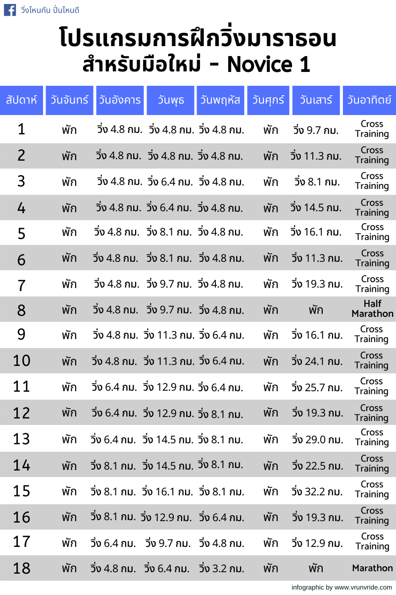 โปรแกรมการฝึกวิ่งมาราธอนสำหรับมือใหม่ – Novice 1 ระยะเวลา 18 สัปดาห์