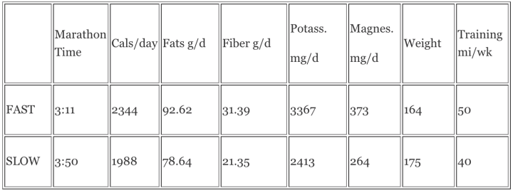 นักวิ่งกลุ่มที่วิ่งเร็ว (กลุ่ม Fast) มีการบริโภคไขมันมากกว่ากลุ่มนักวิ่งที่วิ่งช้า (กลุ่ม Slow) โดยเฉพาะไขมันไม่อิ่มตัวเชิงเดี่ยวและไขมันไม่อิ่มตัวเชิงซ้อน นอกจากนี้พวกเขายังได้รับแคลอรี่มากขึ้น (ส่วนใหญ่มาจากการบริโภคไขมันมากขึ้น), โพแทสเซียม, แมกนีเซียม และไฟเบอร์ แม้ว่านักวิ่งเร็วจะมีน้ำหนักน้อยกว่านักวิ่งช้า และมีการซ้อมวิ่งมากกว่า 50 ไมล์ต่อสัปดาห์เทียบกับนักวิ่งช้าที่ซ้อม 40 ไมล์ต่อสัปดาห์ก็ตาม แต่ความแตกต่างทั้งสองอย่างนี้ไม่มีนัยสำคัญ