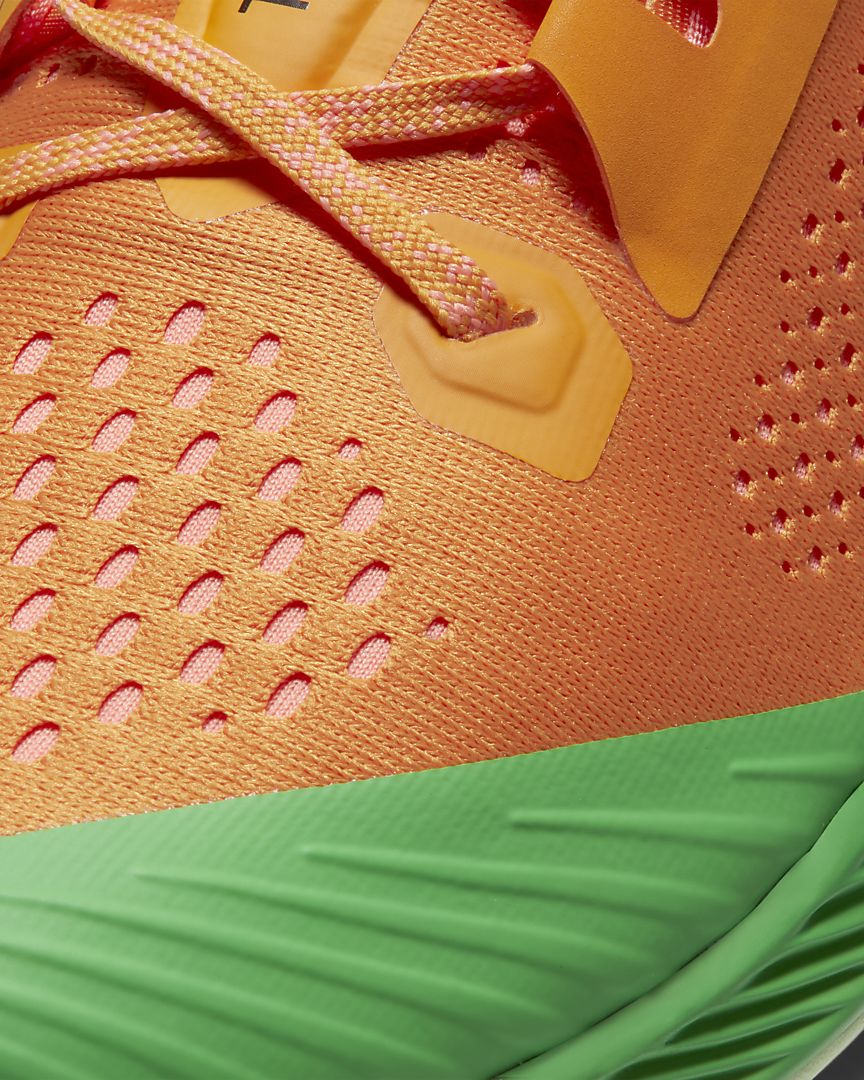 Toe cap เป็นสีเขียว Green Spark ตัดกับอัปเปอร์ตาข่ายสีส้มจี๊ดที่ระบายอากาศได้ดี ส่วน heel tab เป็นห่วงสีชมพู