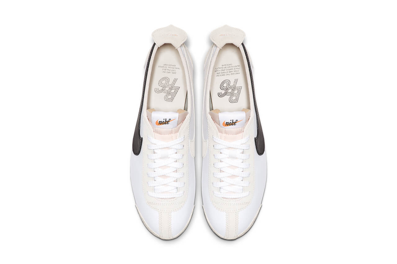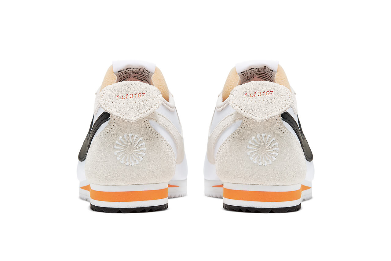 Cortez ’72 ส่วน upper ใช้หนังสีขาวเป็นฐานและวางซ้อนทับกันด้วยหนังกลับสีแทน ไล่ตั้งแต่ toe cap, heel pull tab, strip ไปจนถึง toe box ซึ่งเป็นรายละเอียดที่ถูกดึงมาจากรองเท้า Onitsuka Tiger Mexico 66 ด้านข้างของรองเท้าทั้งสองด้านมี Swooshes ที่ด้านหนึ่งทำเป็นหนังสีดำ และอีกด้านทำเป็นหนังนิ่มสีแทน