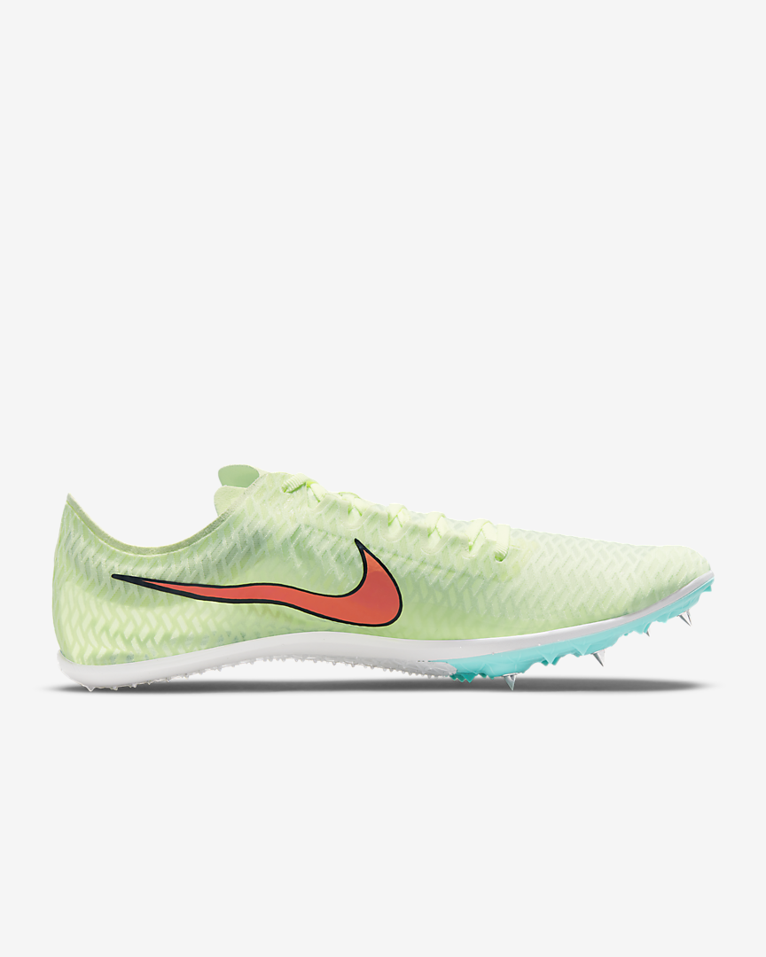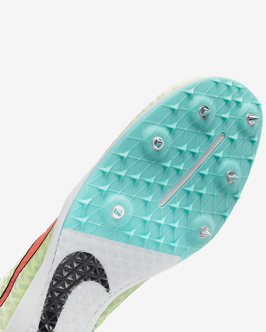 รองเท้าวิ่งตะปูที่มี Swoosh สีแดงตัดกับสีเขียว “Barely Volt” และแผงตะปูบริเวณใต้หน้าเท้าที่เป็นสีฟ้า ถึงจะใช้สีไม่เยอะเหมือนคู่อื่นใน Collection แต่ก็ดูสวยงามอย่างลงตัว