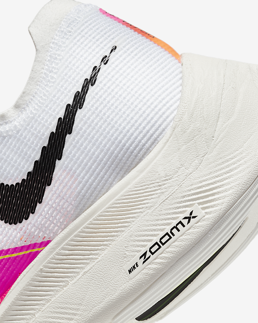 Nike ZoomX Vaporfly Next% 2 “Rawdacious” มองไปตรงที่ Stripe ที่เป็นเอกลักษณ์ของรุ่นนี้จะนำมาด้วยสีชมพู Pink Blast ตามด้วยสีแดง Bright Crimson อยู่ตรงโฟม ZoomX บริเวณหน้าเท้า และสีส้ม Total Orange ในโลโก้ Nike ที่ลิ้นรองเท้า และบริเวณส้นเท้าจะเป็นการไล่สีของ สีชมพู Pink Blast และ สีส้ม Total Orange อย่างสวยงาม