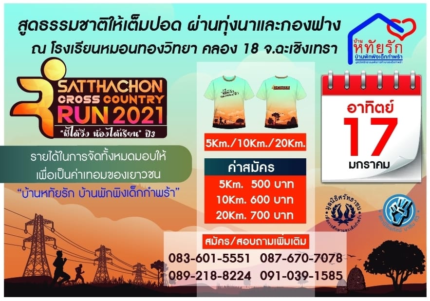 ขอเชิญร่วมกิจกรรมวิ่งการกุศล Satthachon Cross Country Run 2021 พี่ได้วิ่ง น้องได้เรียน ครั้งที่ 3 เพื่อหารายได้เป็นทุนการศึกษาให้เด็กกำพร้า บ้านหทัยรัก (คลองสามวา กรุงเทพฯ)