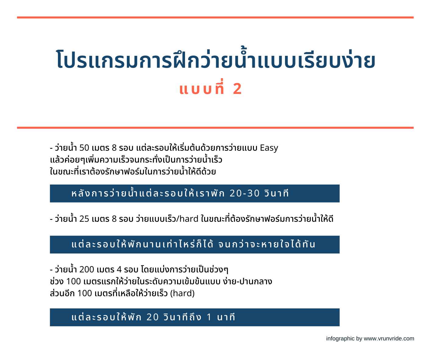 - ว่ายน้ำ 50 เมตร 8 รอบ แต่ละรอบให้เริ่มต้นด้วยการว่ายแบบ Easy แล้วค่อยๆเพิ่มความเร็วจนกระทั่งเป็นการว่ายน้ำเร็ว ในขณะที่เราต้องรักษาฟอร์มในการว่ายน้ำให้ดีด้วย และหลังการว่ายน้ำแต่ละรอบให้เราพัก 20-30 วินาที