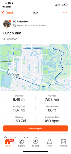 - #PaceMap เส้นแสดงอัตราการก้าวเท้าเฉลี่ยที่สูงกว่าจะเป็นสีน้ำเงินเข้ม