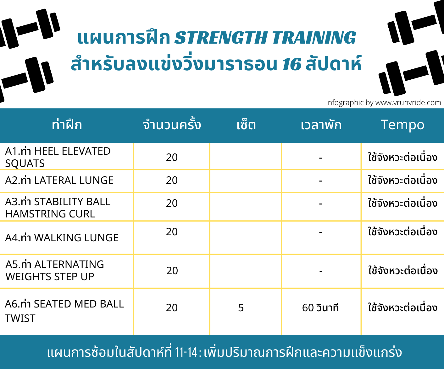 สัปดาห์ที่ 11-14 : จะเป็นช่วงที่มีปริมาณการฝึกเพิ่มขึ้นสูงและเพิ่มความแข็งแกร่งให้กล้ามเนื้อ