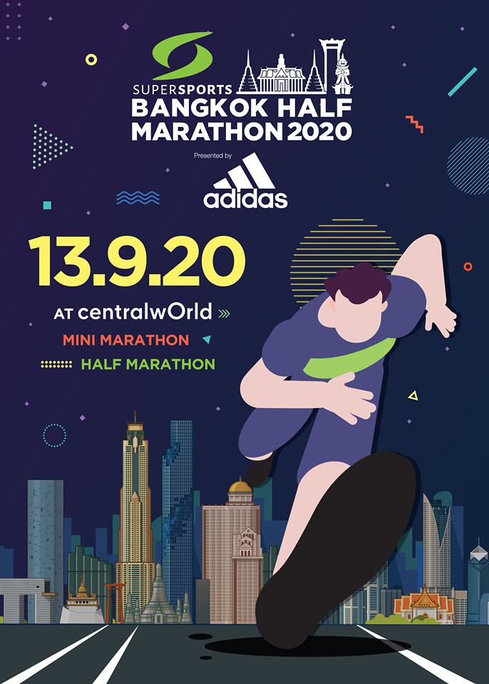Supersports Bangkok Half Marathon 2020 มีกำหนดจัดขึ้นในวันที่ 13 กันยายน 2563 ที่ลานหน้าห้างเซ็นทรัลเวิลด์ ซึ่งสถานที่การจัดงานถือว่าอยู่ใจกลางเมืองกรุงเทพฯ ตอบโจทย์ในการเดินทางที่สะดวกสบาย และสามารถรองรับนักวิ่งได้จำนวนมาก นอกจากนี้ยังมีนักแสดงหนุ่ม พระเอกหน้าใหม่อย่าง “จอส -เวอาร์ แสงเงิน” จากละครเรื่อง เกมรักเอาคืน ทางช่อง GMM25 พร้อมทั้งคุณ ตุลย์ – ตุลยเทพ เอื้อวิทยา กัปตันทีม adidas runners bangkok และลูกทีมadidas runners ที่จะมาเป็นเพซเซอร์ มาร่วมในกิจกรรมครั้งนี้อีกด้วย