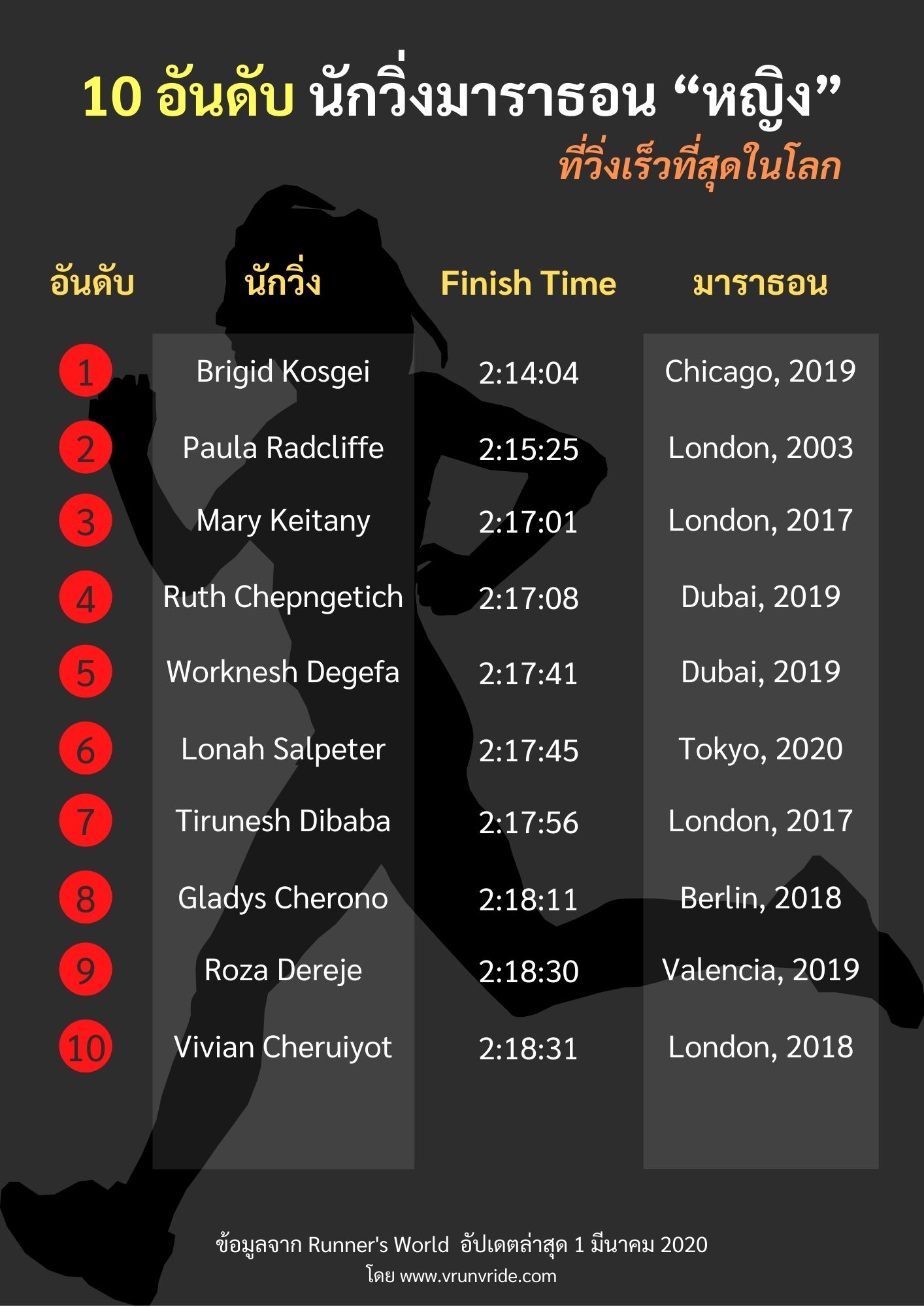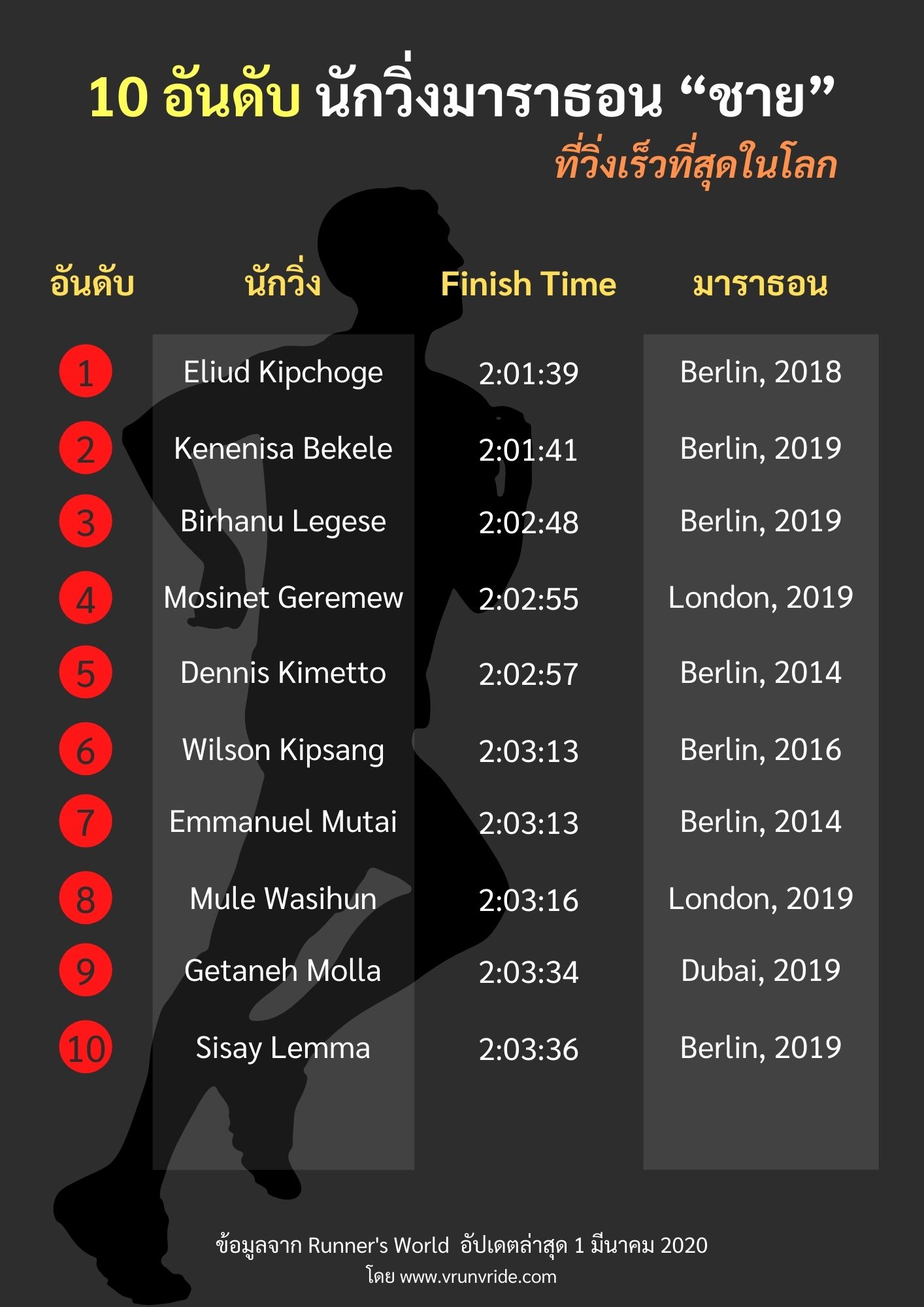 Runner’s World นิตยสารวิ่งชื่อดังระดับโลก ได้เผยแพร่รายชื่อ 10 อันดับนักวิ่งมาราธอน เจ้าของสถิติโลก World Record ชายและหญิง โดยเป็นข้อมูลอัปเดตล่าสุดเมื่อวันที่ 1 มีนาคม 2020