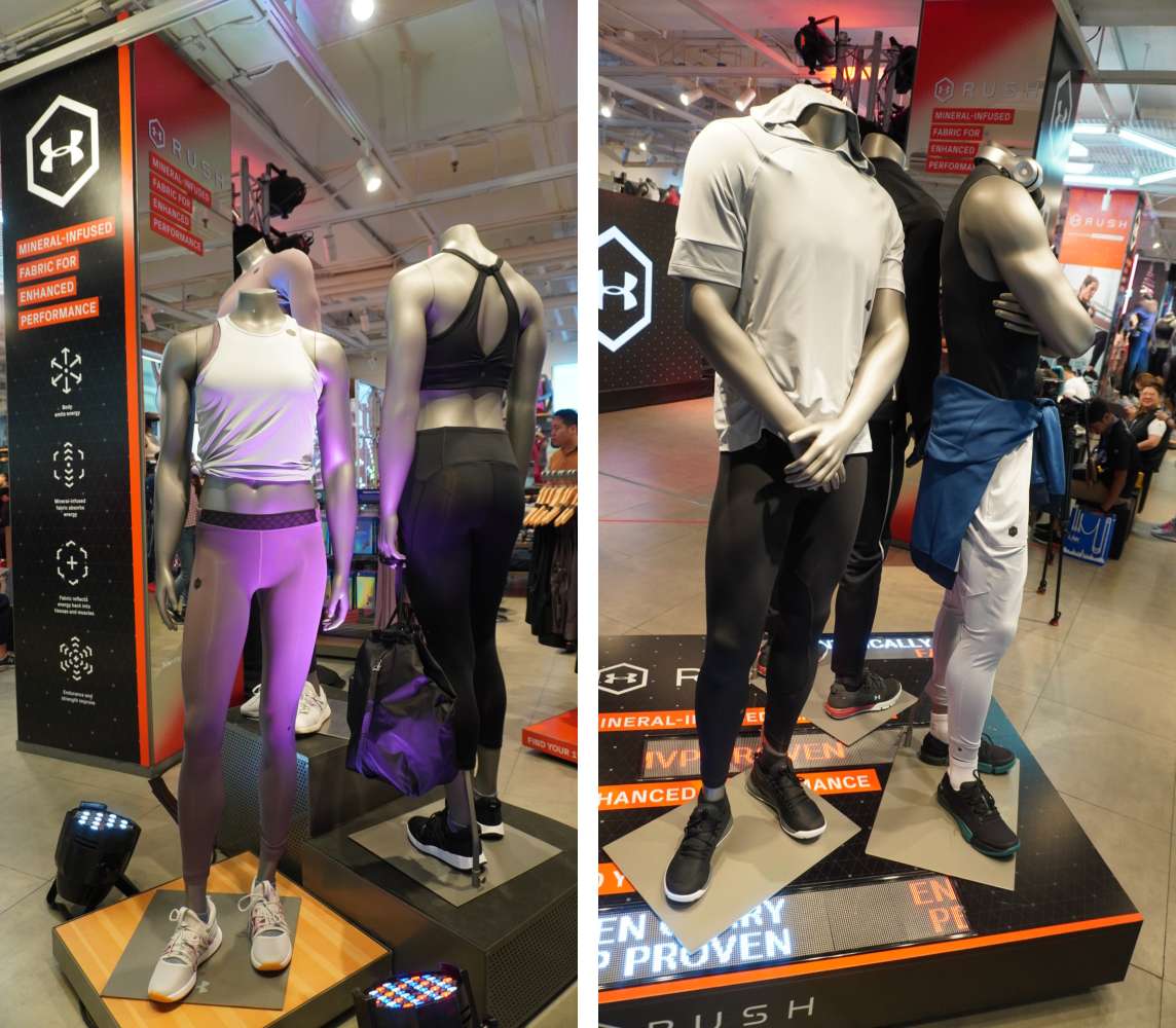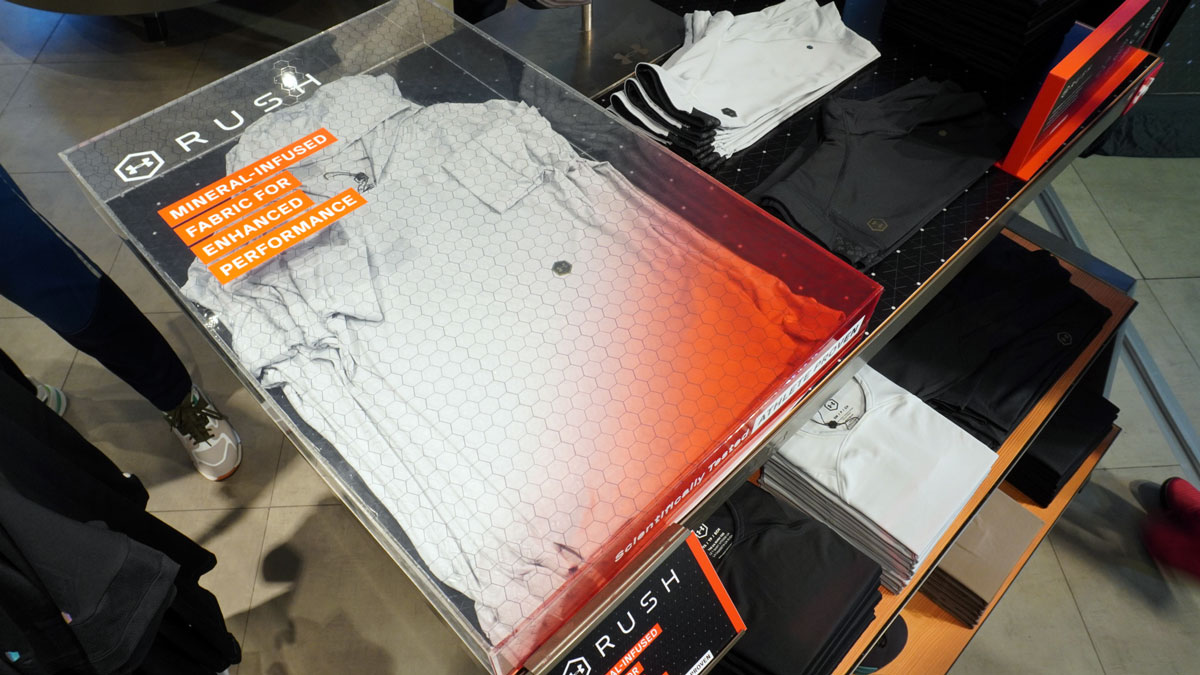 คอลเล็กชั่นเสื้อผ้ากีฬาUA RUSH มีความพิเศษในการนำเอาแร่ธาตุมาใช้ในเนื้อผ้า ที่ประกอบด้วย ไทเทเนียม ไดออกไซด์ ที่มีพลังช่วยดูดซึม ซิลิคอน ไดออกไซด์ ช่วยสะท้อนพลังงานและการดูดซึม และอลูมินัม ไดออกไซด์ ช่วยเพิ่มประสิทธิภาพการสะท้อนกลับของพลังงานได้ดียิ่งขึ้น โดยแร่ธาตุทั้งหมดจะถูกนำเข้ากระบวนการบดอัดจนมีขนาดเล็กกว่า 1 ไมคอน เพื่อนำไปใช้เป็นส่วนประกอบของเส้นใยในเนื้อผ้า
