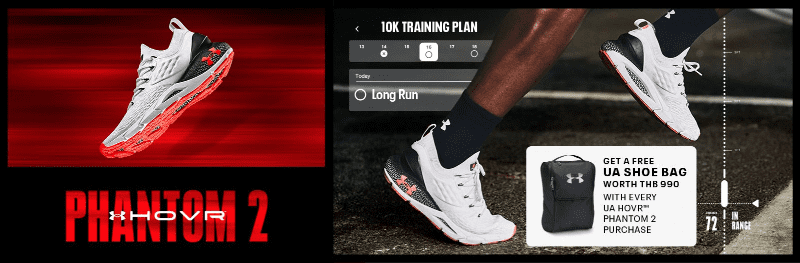UA HOVR Phantom 2 วางจำหน่ายแล้วในเว็บไซต์ www.underarmour.co.th ราคา 5,790 บาท มีทั้งหมด 5 สี (ชมภาพได้ที่ท้ายบทความ) พิเศษ! ทุกการสั่งซื้อ UA HOVR Phantom 2 จะได้รับกระเป๋ารองเท้า UA Shoe Bag ฟรี มูลค่า 990 บาท